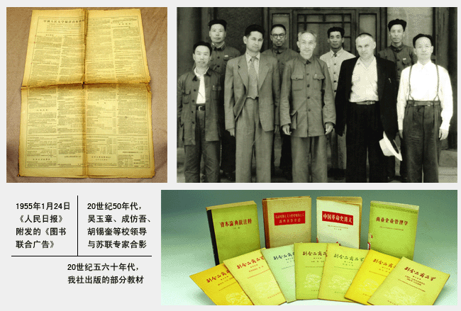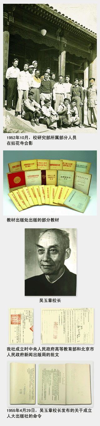 “教学与实际联系,苏联经验与中国情况相结合”教育方针的情况和经验。时任高等教育部副部长的杨秀峰同志在会议闭幕式上讲话,要求各学校根据自己的情况来推广人民大学的经验。会后,各部委和各地方兄弟院校纷纷来信要求人民大学提供教材。当时的教材出版处由于规模小不能完成这一任务,所以高等教育部就提出由人民大学推荐一批教材公开出版。当时学校研究部请苏联专家推荐了81种,后又压缩至22种,这22种由高等教育部分到当时北京的几家出版社来出版。但是,这22种书中,最初只有《统计学原理》、《工业企业组织与计划教程》两本在使用了教材出版处原来铅印教材的纸型,仅更换了封面的情况下公开出版了,其他的大部分教材都未能正式出版。这件事给了教材出版处的同志很大的启发,教材出版处的陈维雄(时任教材出版处副主任)与齐振之(时任教材出版处副主任)、王颖(时任教材出版处办公室业务秘书)等同志一起商量,一致的看法是,既然社会上对人民大学的教材有大量的需求,而教材出版处又有能力编辑出书,只是不能公开出版、发行,那么建立出版社是解决这个矛盾的最佳途径,于是向学校研究部副部长张腾霄同志作了汇报。在张腾霄副部长的支持下,教材出版处写了一个建立出版社的报告呈递校长。
